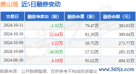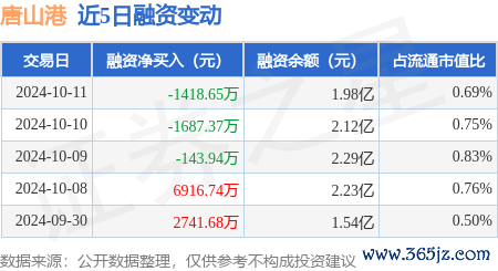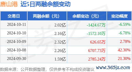 本站音问,10月11日,唐山港(601000)融资买入1899.19万元,融资偿还3317.85万元kaiyun官方网站,融资净卖出1418.65万元,融资余额1.98亿元。