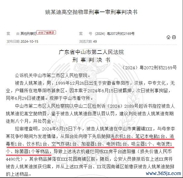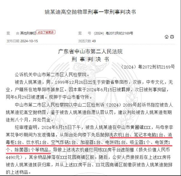 判决文告透露,6 月 15 日下昼,姚某在中山市黄圃镇某小区,与母亲争吵时刻为发泄模式,从 8 楼阳台向楼下先后抛掷洗衣机 1 台、条记本电脑 1 台、消毒柜 1 台、饮水机 1 台、空气炸锅 1 台、加湿器 1 台、电饼铛 1 台、吸尘器 1 个、电饭煲 1 个、除菌器 1 个等物品,其中洗衣机砸烂同栋一平台遮阳棚,变成耗费价值东谈主民币 4490 元,其余物品掉落在小区商铺区前。随后,公安东谈主员接报后将姚某持获,并找到了其抛掷的物品。