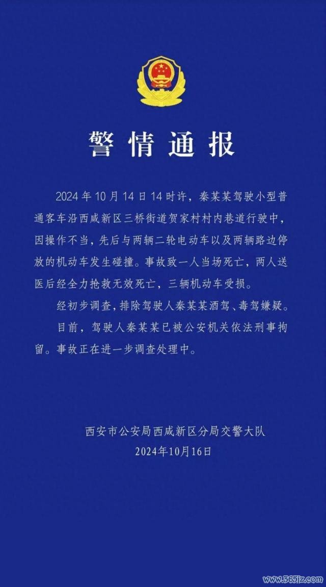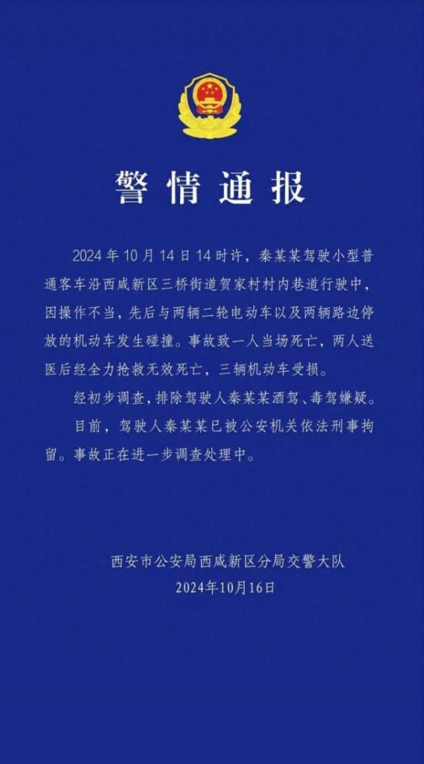 西安市公安局西咸新分袂局交警大队 16 日晚发布警情通报称:2024 年 10 月 14 日 14 时许,秦某某驾驶袖珍鄙俚客车沿西咸新区三桥街说念贺家村村内巷说念行驶中,因操作不当kaiyun体育,先后与两辆二轮电动车以及两辆路边停放的活泼车发生碰撞。事故致一东说念主就地示寂,两东说念主送医后经全力抢救无效示寂,三辆活泼车受损。 经初步访谒kaiyun体育,放手驾驶东说念主秦某某酒驾、毒驾嫌疑。现在,驾驶东说念主秦某某已被公安机关照章刑事拘留。事故正在进一步访谒经管中。