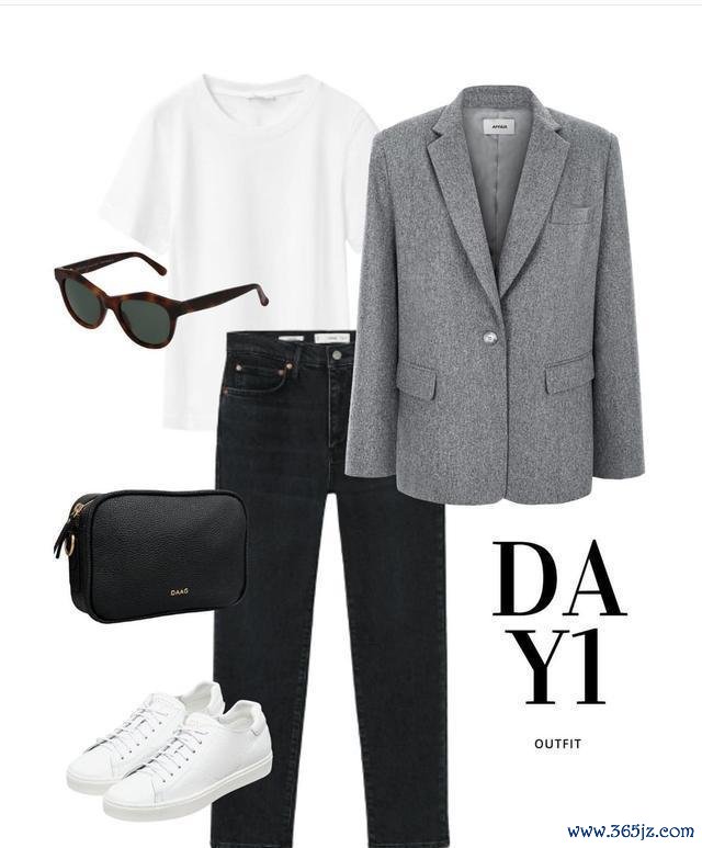 一件西装当主打,2 条裙子和 1 条牛仔裤作念下装,上衣有高领毛衣和 T 恤衫就够啦。搭配一驱动就从最省略的公式来就行,白 T 加黑牛仔裤又酷又开畅,再加上一件冷灰色西装就更有知性气质啦,既直率又大方。