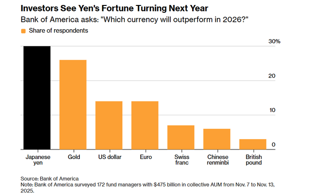 好意思国银行探望露出,大众投资者以为日元来岁将打败其他主要货币,瞻望其将在履历涟漪的一年后反弹——本年日元兑好意思元答复率是主要货币中最差的。