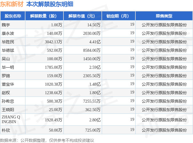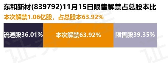 证券之星讯息,把柄阛阓公开信息整理,东和新材(839792)于11月15日将有1.06亿股限售股份解禁,为公司公成就行原鼓励限售股份,占公司总股本63.92%。(本次数据把柄历史公告整理得出,骨子情况以上市公司最新公告为准)最近一年内,该股累计解禁540.41万股,占总股本的3.26%。本次解禁后,公司还有6514.59万股限售股份,占总股本39.35%。具体如下图所示: